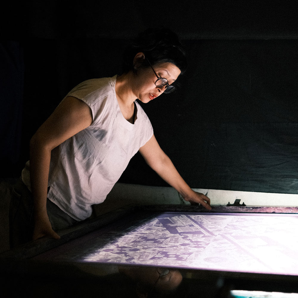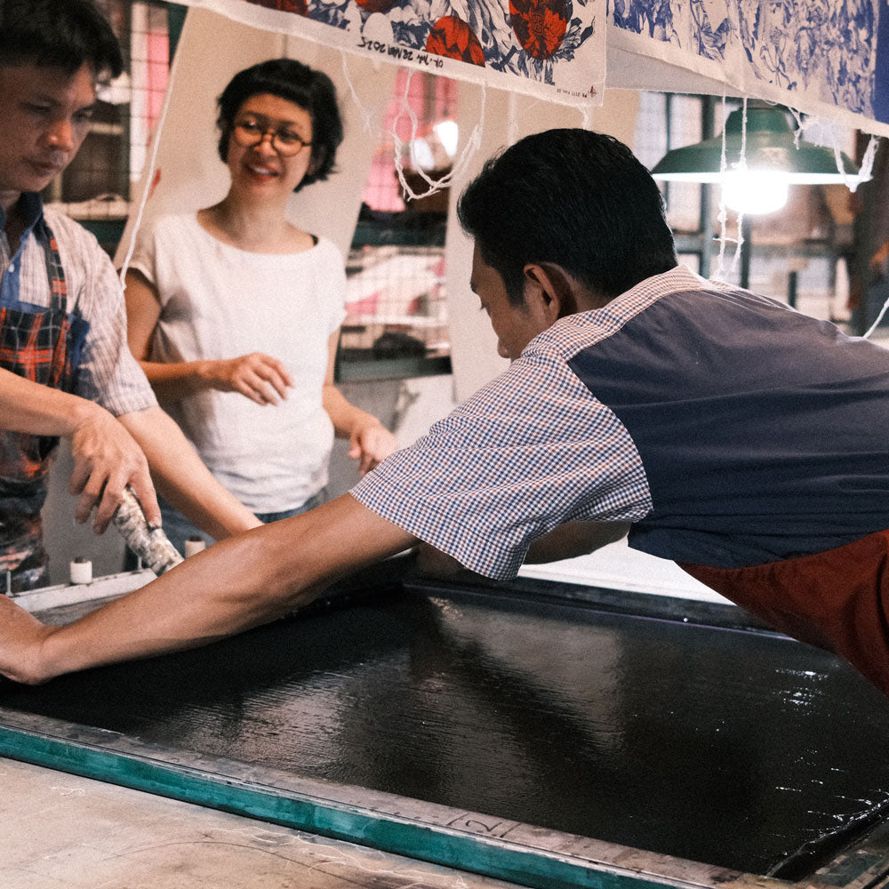 Hand-pulled printing is a labour-intensive process requiring the skill of two to three artisans, while using significantly less water than automated machines. Heat curing and manual pressure can cause shrinkage or image variation, meaning each impression is unique—shaped by the reactions of humidity and pigment. At Tulisan, we embrace these natural imperfections as markers of authenticity, shifting perceptions of craftsmanship from uniformity to individuality. We strictly avoid materials and methods linked to animal cruelty, toxic chemicals, or environmental harm, ensuring that every design decision aligns with fair and ecological values. Our use of eco-friendly pigments yields organic impressions that convey emotional depth and authenticity. This approach sustains artisanal traditions, creates meaningful job opportunities, and empowers makers whose skills infuse each piece with character and cultural resonance.